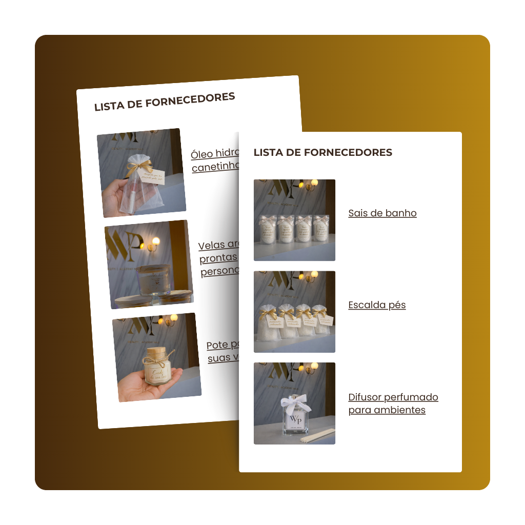 Você terá acesso a uma lista com indicações de fornecedores, lojas e locais para comprar os mimos das campanhas, desde frascos, produtos a rotúlos.